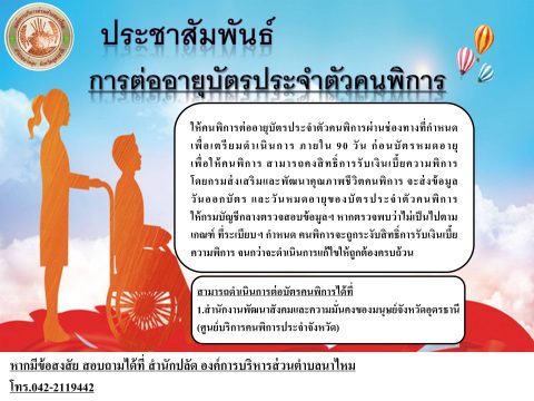 ประชาสัมพันธ์ การต่ออายุบัตรประจำตัวคนพิการ . สามารถยื่นคำขอต่ออายุล่วงหน้า 90 วัน ก่อนวันหมดอายุ . ขอให้คนพิการ และผู้ดูแลคนพิการตรวจสอบบัตรประจำตัวคนพิการ กรณีพบว่าบัตรเดิมหมดอายุ ชำรุด สูญหาย มีการเปลี่ยนแปลงในสาระสำคัญเกี่ยวกับคนพิการ หรือคนพิการมีอายุครบหกสิบปีบริบูรณ์ ให้ดำเนินการต่ออายุบัตร เมื่อดำเนินการต่อบัตรประจำตัวคนพิการแล้ว ให้นำบัตรประจำตัวคนพิการฉบับใหม่มาแจ้งกับเจ้าหน้าที่ฝ่ายพัฒนาชุมชนและสวัสดิการสังคม ตามพื้นที่เขตที่ตนมีชื่ออยู่ในทะเบียนบ้าน เพื่อเจ้าหน้าที่จะดำเนินการปรับปรุงฐานข้อมูลให้เป็นปัจจุบัน และจะได้รับเบี้ยความพิการได้ต่อเนื่อง