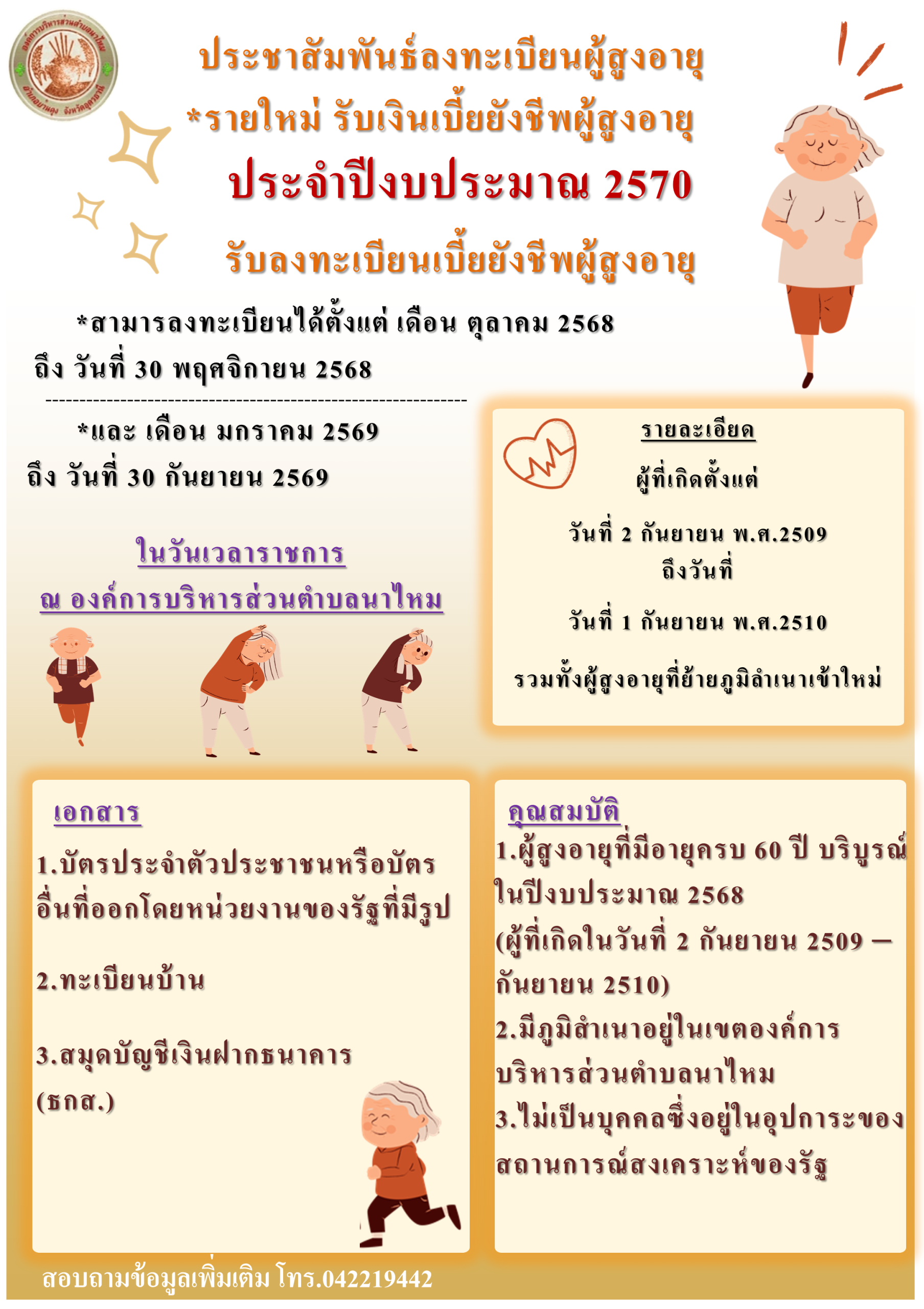 Posted in ข่าวประชาสัมพันธ์ ประชาสัมพันธ์ การลงทะเบียนรับเงินเบี้ยยังชีพผู้สูงอายุ ประจำปีงบประมาณ 2570 เพื่อรับเบี้ยยังชีพผู้สูงอายุ ประจำปีงบประมาณ พ.ศ.2570 เปิดรับลงทะเบียน ตั้งแต่ เดือนตุลาคม 2568 – เดือนพฤศจิกายน 2568 และเดือนมกราคม 2569 – เดือนกันยายน 2569 ให้ผู้สูงอายุรายใหม่ที่ยังไม่เคยลงทะเบียนมาก่อนซึ่งเป็นผู้สูงอายุที่มีอายุครบ 60 ปีบริบูรณ์แล้ว และผู้สูงอายุที่จะมีอายุครบ 60 ปีบบริบูรณ์ ในปีงบประมาณ พ.ศ.2570 ซึ่งนับอายุจนถึง วันที่ 1 กันยายน 2569 (เกิดก่อน 2 กันยายน 2510) การลงทะเบียนเป็นการยืนยันสิทธิเพียงครั้งเดียว การลงทะเบียนรับเงินเบี้ยยังชีพผู้สูงอายุเป็นการลงทะเบียนเพียงครั้งเดียว การลงทะเบียนไม่มีค่าใช้จ่ายใด mungmee